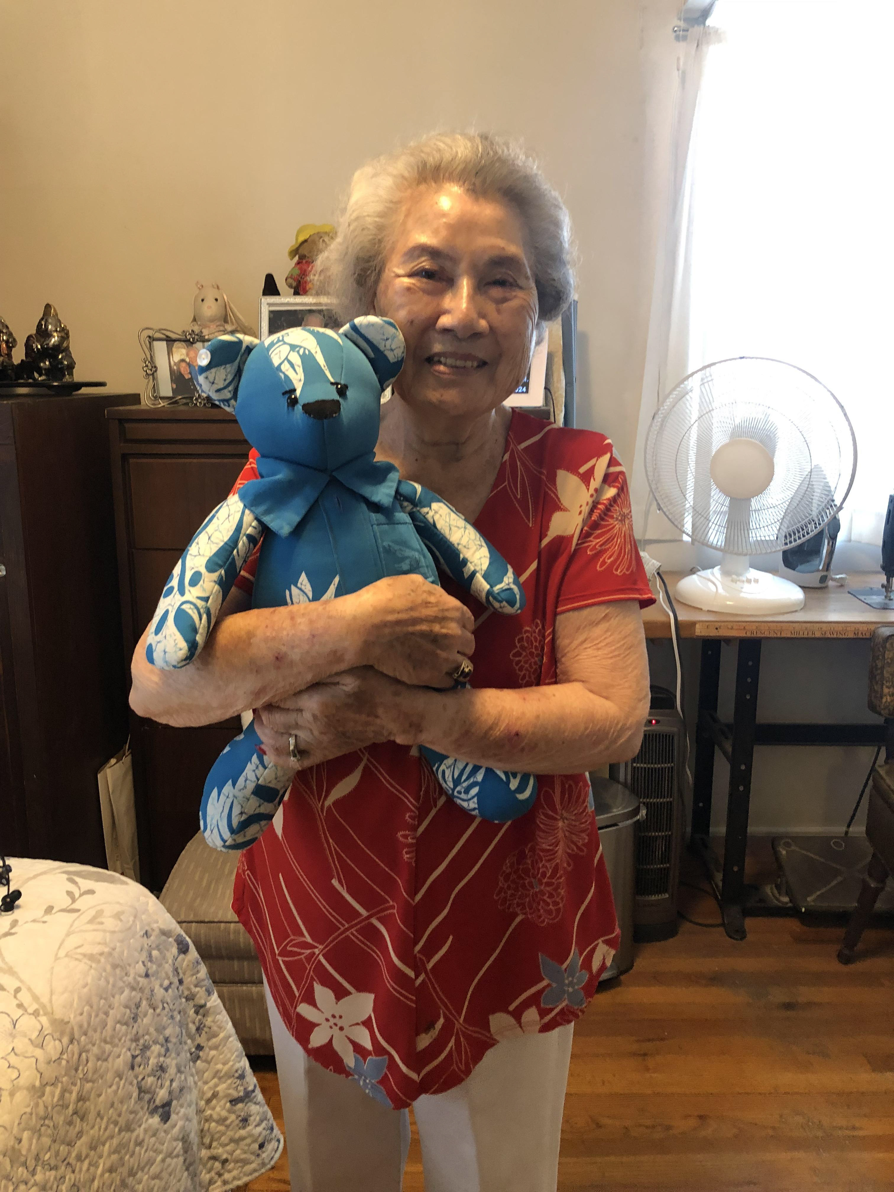 When Elmer passed away in 2018, Sally's daughter had a Memory Bear made from the blue Hawaiian shirt Elmer wore when they first reunited in 2012.